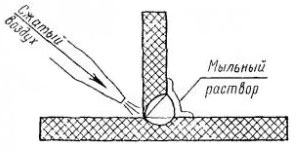 В тех случаях, когда изделие нельзя накачать воздухом, можно применить упрощенный вариант пневматического испытания, обдувая шов с одной стороны струей воздуха под давлением, а с другой - обмазав его мыльным раствором. В этом случае в зоне обдува создается подпор воздуха, который проявляет себя появлением пузырьков с обратной стороны (при наличии сквозных дефектов).