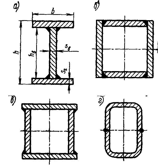 Наиболее часто применяют сварные балки двутаврового (Рис. 7.1, а) и коробчатого (Рис. 7.1, б, в) профилей,