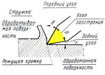 Грань, по которой сходит стружка при резании, называется передней, а противоположная ей грань, обращенная к обрабатываемой поверхности заготовки, - задней. Пересечение передней и задней граней образуют режущую кромку.