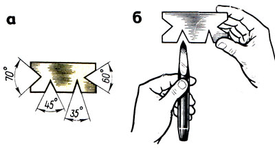 Рис. 60. Шаблон (а) и проверка им угла заточки (б) зубила